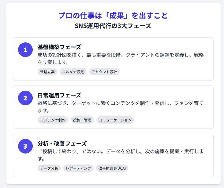 ここでは、SNS運用代行の業務を、大きく3つのフェーズに分けて、その具体的な中身を解き明かしていきます。