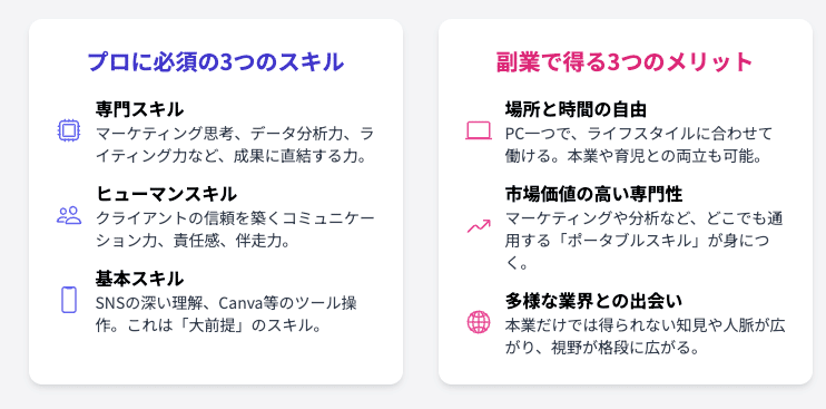 しかし、「副業として継続的に稼ぎ続ける」ことを目指すのであれば、単なる「SNSが使える人」から「SNSマーケティングの専門家」へと脱皮するためのスキル習得が絶対に必要です。