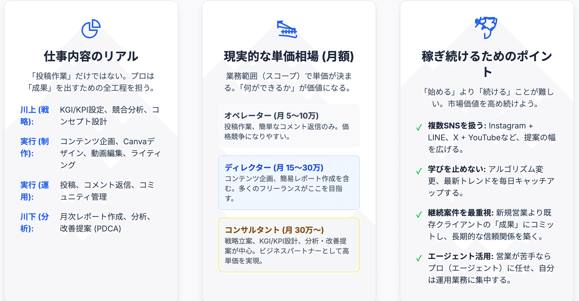 この戦略立案フェーズを丁寧に行うことで、クライアントとの目線合わせができ、後の運用がスムーズに進むだけでなく、「この人はただの作業者ではない」という専門家としての信頼を勝ち取ることができるのです。