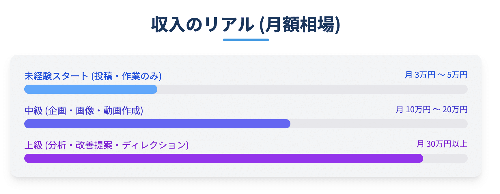 巷では「月3,000円から30,000円程度」といった情報も見受けられますが、2025年現在の実態、特に私たちが目指すべき「専門職」としての相場観からすると、この数字は少し実態と異なるか、あるいは極めて限定的な業務(例:1日数件の『いいね』回り作業のみ)を指している可能性が高いです。