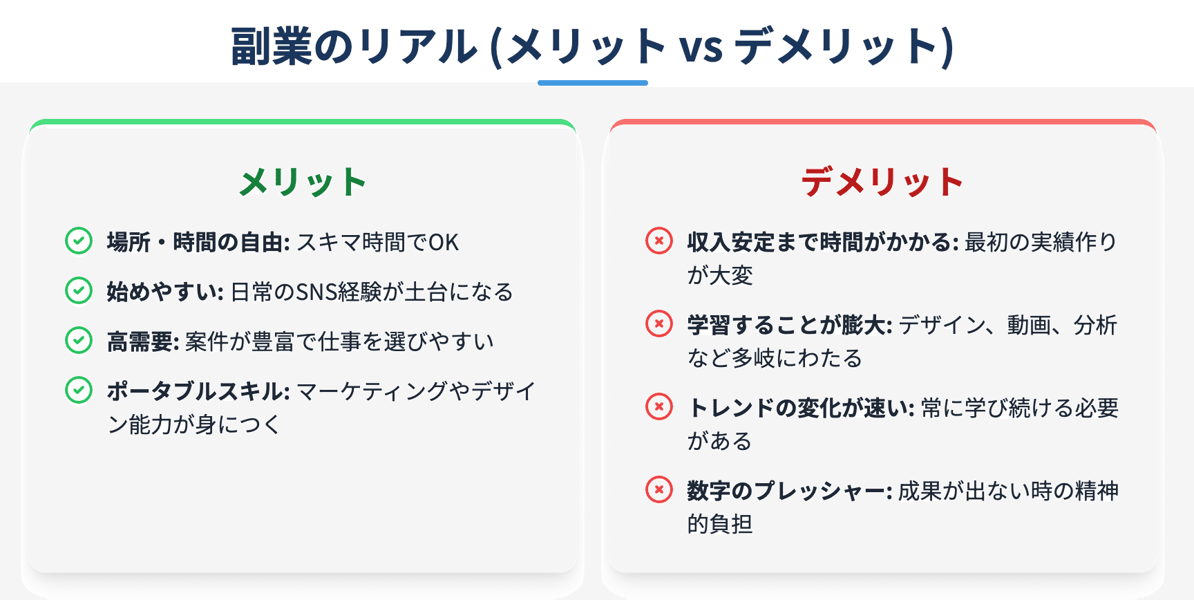 この記事では、私が未経験からSNS運用代行の副業を始めた経験に基づき、その仕事内容、メリット・デメリット、そして具体的な始め方まで、徹底的に深掘りしてきました。