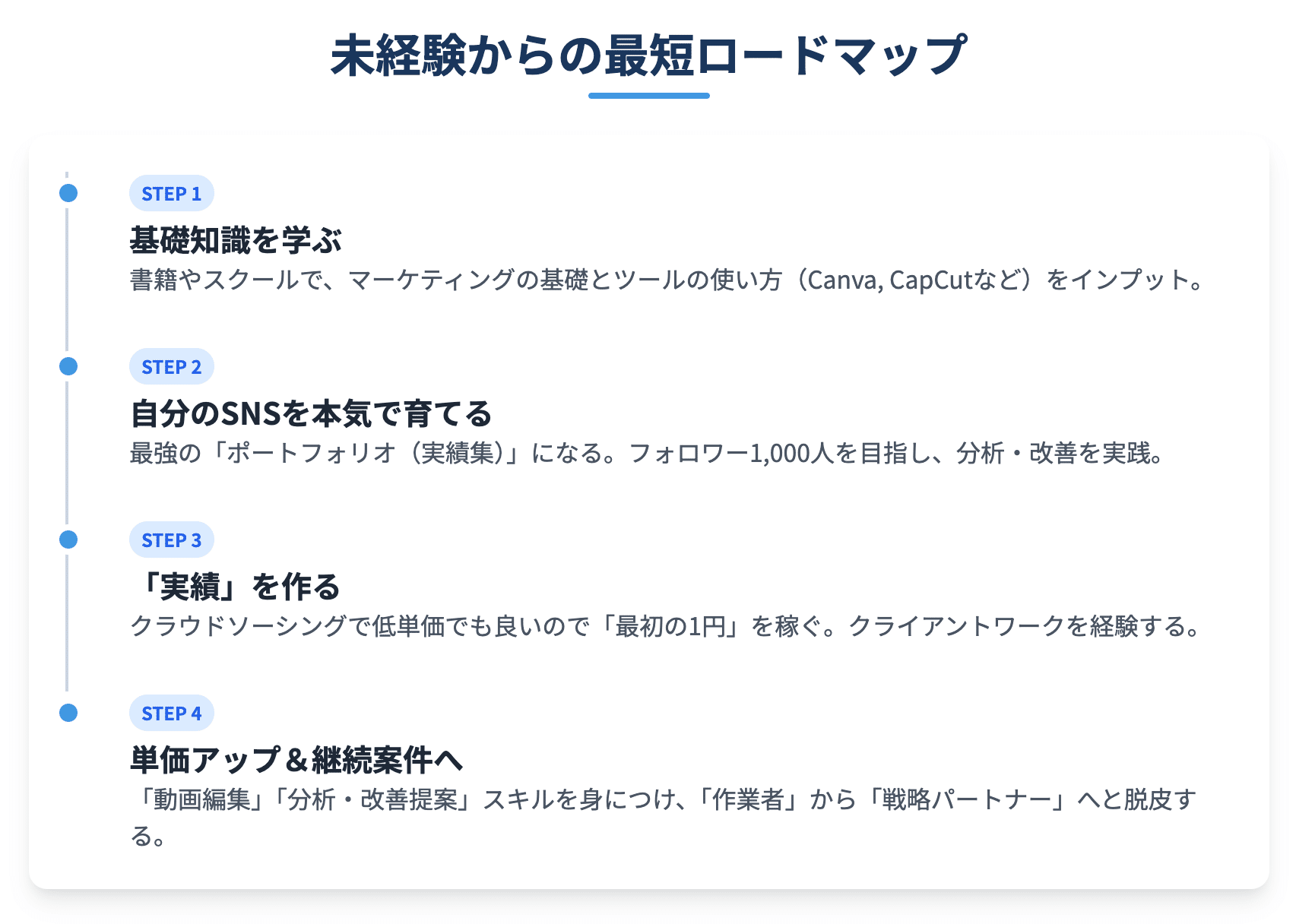 「企業(他人)のお金で、SNS運用に関わった」という経験そのものが、次のステップに進むための信頼となるのです。