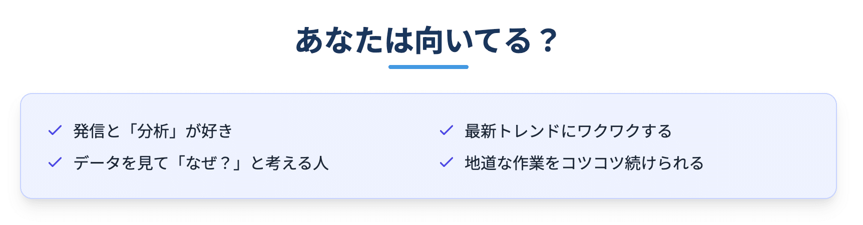 この「地道な作業をコツコツ続けられるか」は、SNS運用代行に向いているかどうかの一つの試金石とも言えるでしょう。