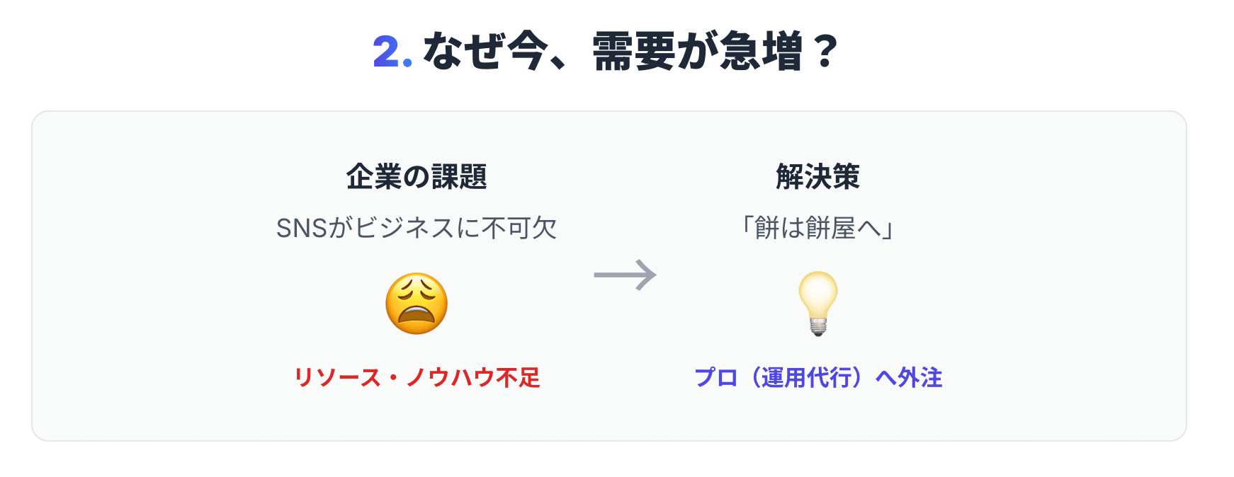 だからこそ、「餅は餅屋へ」と、その道のプロフェッショナル、すなわちSNS運用代行の専門家に外注(アウトソーシング)する流れが加速しているのです。