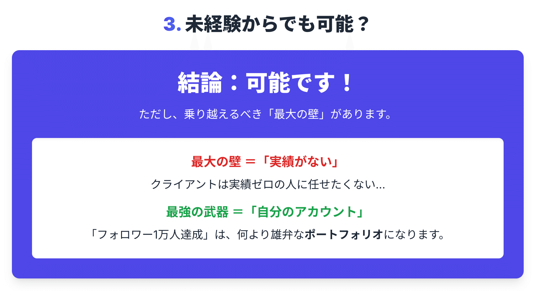 SNS運用代行の厳しい現実をお伝えしましたが、それは決して「未経験者には無理だ」と突き放すためではありません。
