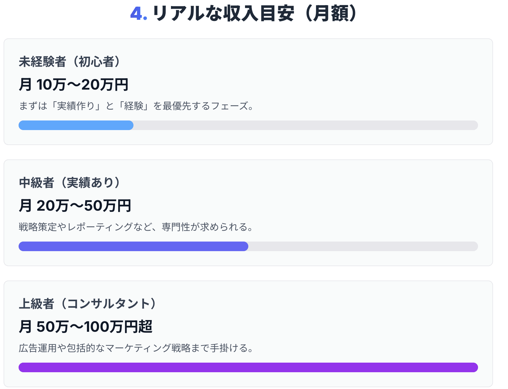 さらに、複数のアカウント運用で培った知見を活かし、SNS広告の運用代行や、包括的なマーケティング戦略のコンサルティングまで手掛けられる「上級者」の領域に達すれば、収入は青天井となっていきます。